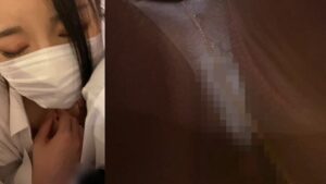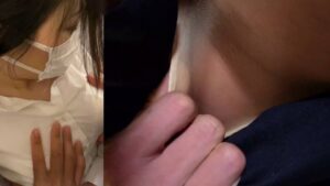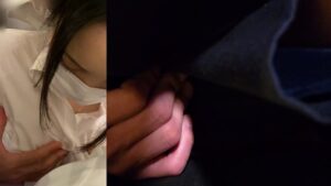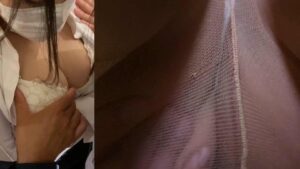 [1:09~5:29]正面からみても美人。目はぱっちり二重でメイクもばっちり。眉毛もしっかりあって日本女性らしいです。前から胸元をみるとやっぱり透けていて薄くレース地が透けて見えます。胸元を手でおさえているので恥ずかしいのか。透けブラにならざるを得ない仕方ない理由があったのかもしれませんね。乗り込んだときには周囲に我々を含め2,3人同業がおり闘争心が芽生えつつも展開が楽しみであります。序盤から上下関係なく手がのびて激しい争いと展開になりそう。タゲと痴漢達の様子見の展開がしばし続きます。