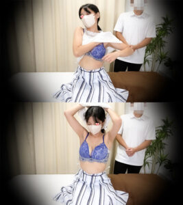 ようやく爆乳のお披露目です!!!小柄で可愛らしいお顔には不釣り合いなほどの爆乳です、、、しかも乳首の色も綺麗な美乳です!これを揉みしだけると思うと、興奮で勃起してしまいそうです、、、