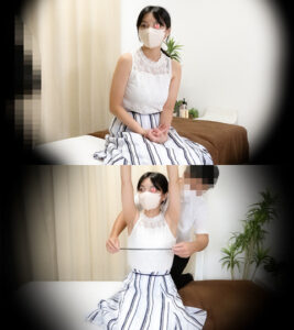この後のマッサージのためにトップレスになってもらいます。