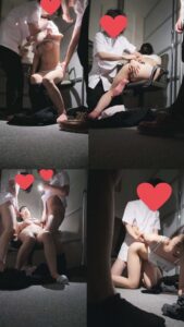 椅子に座らせたまま正常位で挿入し、さらにバックで男性社員に交互にハメられています。椅子から降ろした後バックでハメながらイラマもしていました。