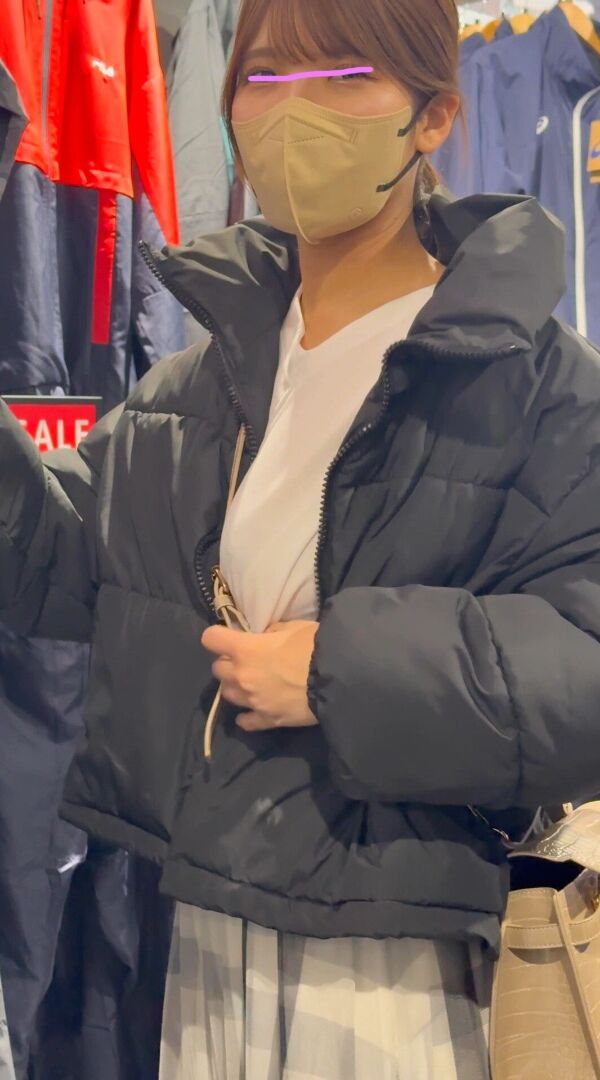 ダウンジャケットのジップを下ろしていくお姉さん。